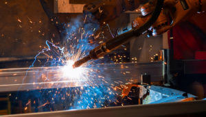 Welding,Robot,,Welds,Metal,Beams.,Modern,Welding,Production.,Bright,Flashes,